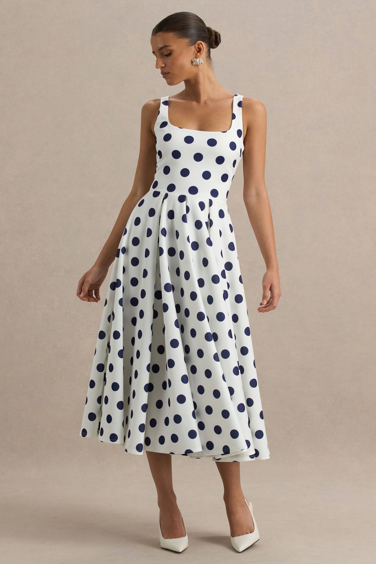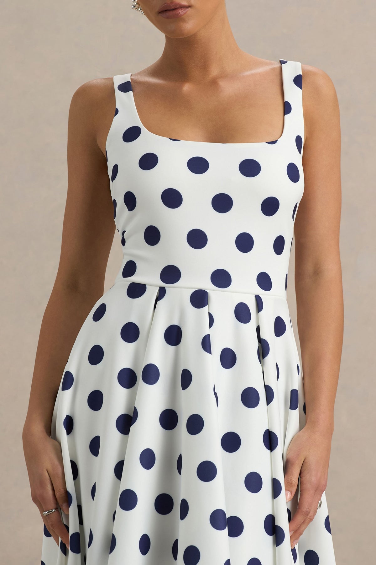 Introducing the perfect timeless addition to your wardrobe, Berta. Crafted in our premium scuba fabric, this midi dress is designed in a classic white hue adorned with bold navy polka dots, giving vintage glamour a modern twist. Featuring a flattering square neckline and cami straps, this piece is as feminine as it is striking. The A-line silhouette skims the body beautifully, flowing into a skirt that moves with grace. Perfect for elegant garden parties or statement daytime soirées.