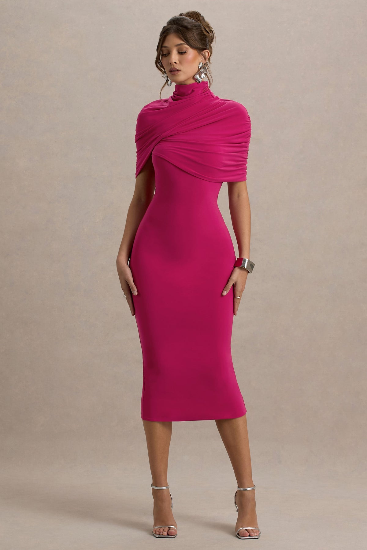 Need a midi wardrobe refresh? We've got you covered...literally. Meet Cecille, the chic cape detailed dress designed for all your modest social occasions this season. Crafted from a hot pink shade of our premium stretch jersey, this style sculpts you in every right place, in the most effortlessly elegant way possible.