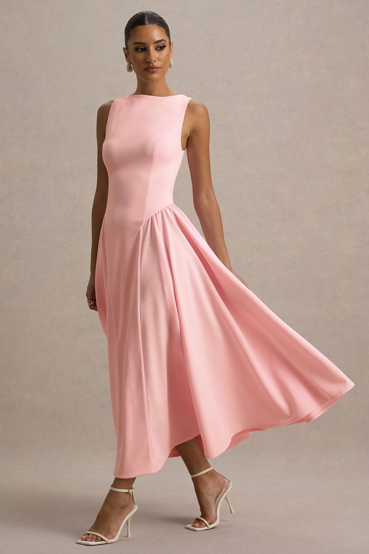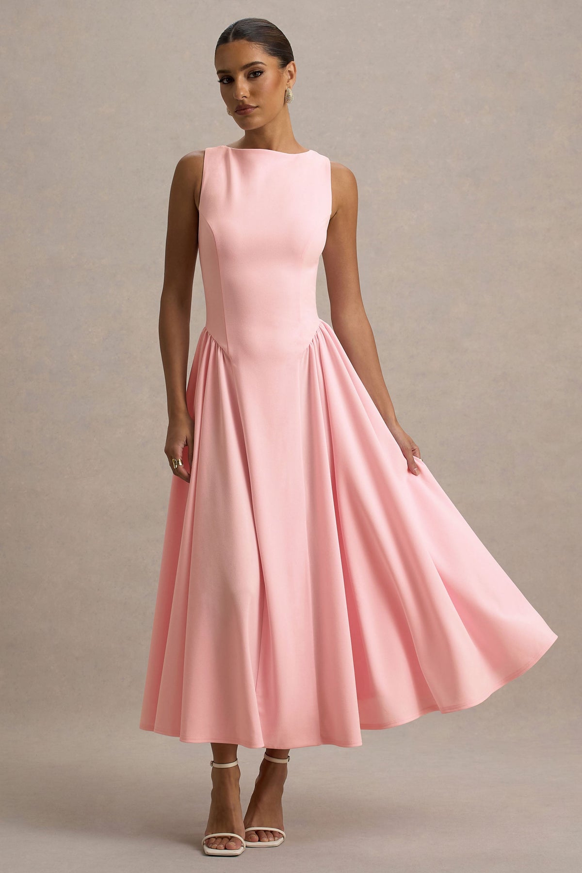 Designed in a timeless, sophisticated silhouette, Muriel was made for special events. Crafted in a pink shade of our premium scuba crepe, this midi dress features a classic boat neckline and wide shoulder straps. With an elegant spin, Muriel reveals a flouncy volume skirt that adds dimension and flair.